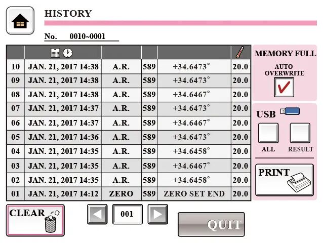 | 【历史记录界面】*多可存储5000条测量记录,并可记录调零/标准数据。 |