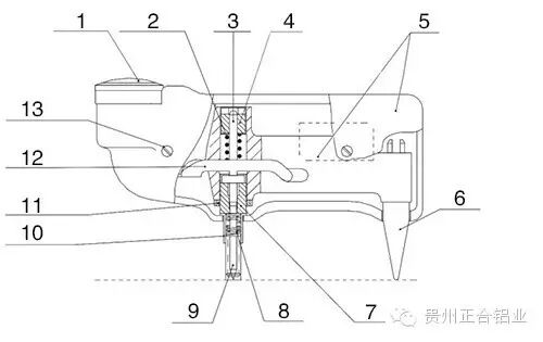 1.指示器 2.负荷弹簧 3.主轴 4.负荷调整螺丝 5.外壳、框架 6.支 脚 7.满刻度调整螺丝 8.弹簧 9.压针 10.弹簧筒 11.锁紧螺母 12.杠杆 13.外壳螺钉