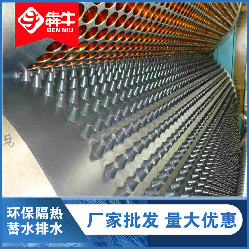 蓄排水板在铺设的时候凸起是朝下的,只有凸起朝下才会体现出蓄排水板上蓄水孔的作用,蓄排水板顾名思义一定要有蓄水和排水作用,如果凸起朝上就完全失去了蓄水的作用,从这一点可以很好的解释,其次蓄排水板哪面向上还可以从蓄排水板铺设中看到,蓄排水板之间利用搭接扣连接。一蓄排水板的铺设规范.防水层及其保护层施工完成后,开始铺装排水板。要求基层排水坡度满足‰~‰;.将排水板杯状口朝上铺装,齿孔相扣,深圳犇牛环保生产的蓄排水板规格皆可定制,施工简单;.排水板上面覆盖土工布,土工布相互搭接0~0cm,防止泥水穿过土工布,淤堵蓄排水系统,造成排水不畅,蓄水量减少等;.在土工布上面铺0~0mm中粗砂,形成渗透过滤层,可阻止种植土流失;.覆盖适当厚度种植土,使用蓄排水板的车库顶板或屋顶花园回填土一般不过0公分;.要做好排水板成品保护。