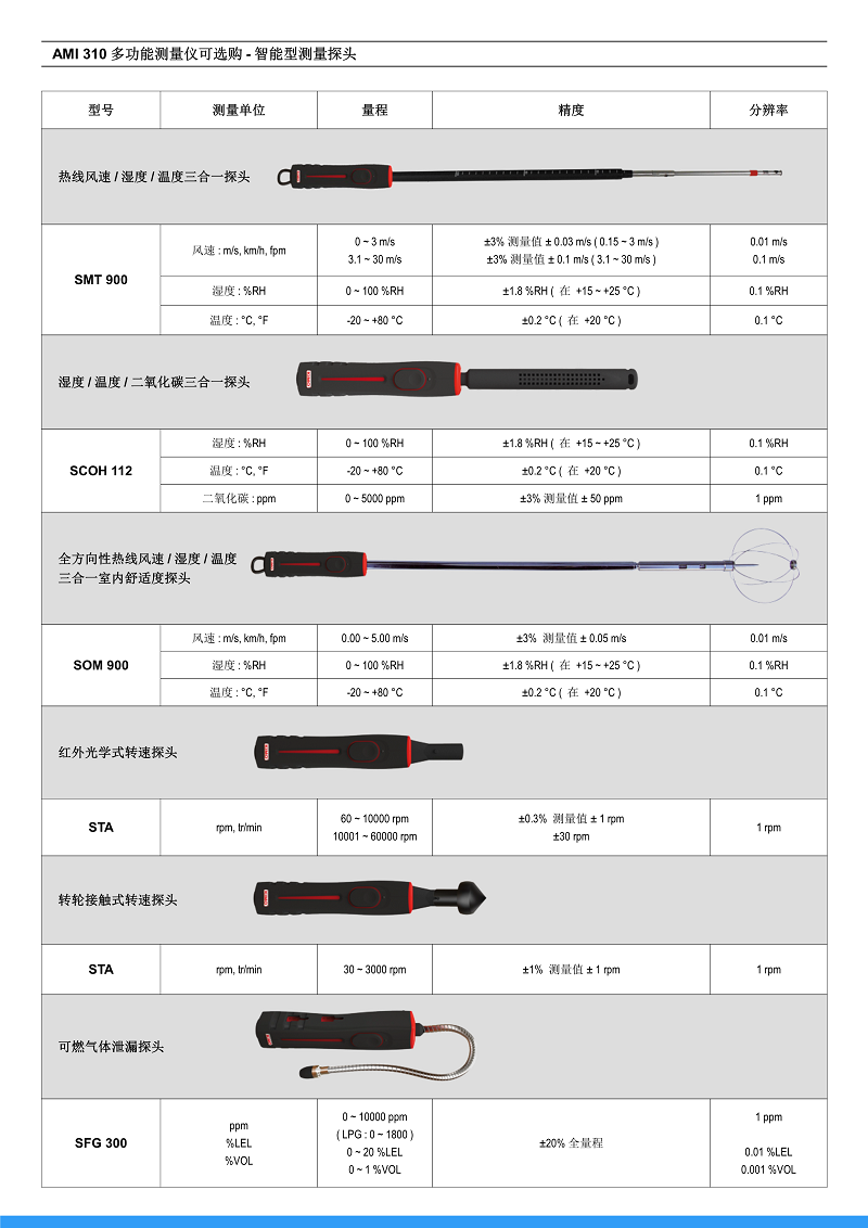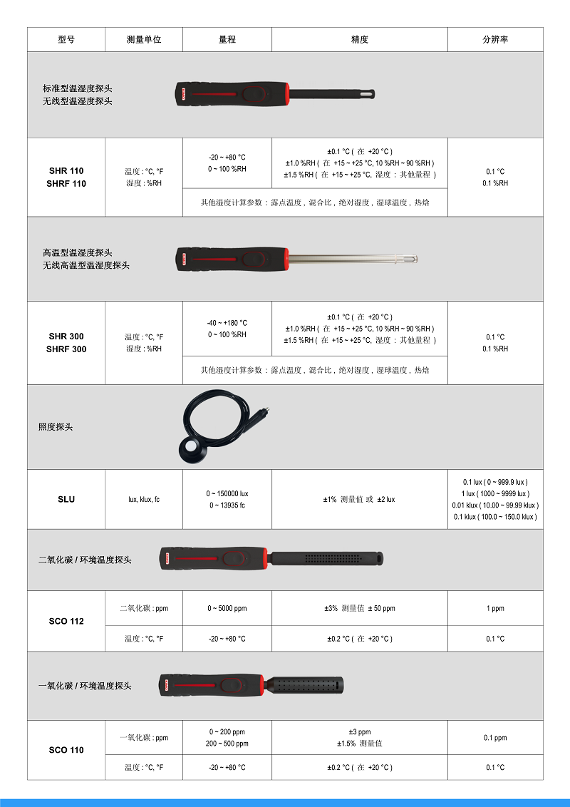 • 便携式测量仪可测量: 差压, 风速, 风量, 温湿度, 温度, 照度, 大气压力, 转速二氧化碳, 一氧化碳, 可燃气体, 室内舒适度, WBGT 指数