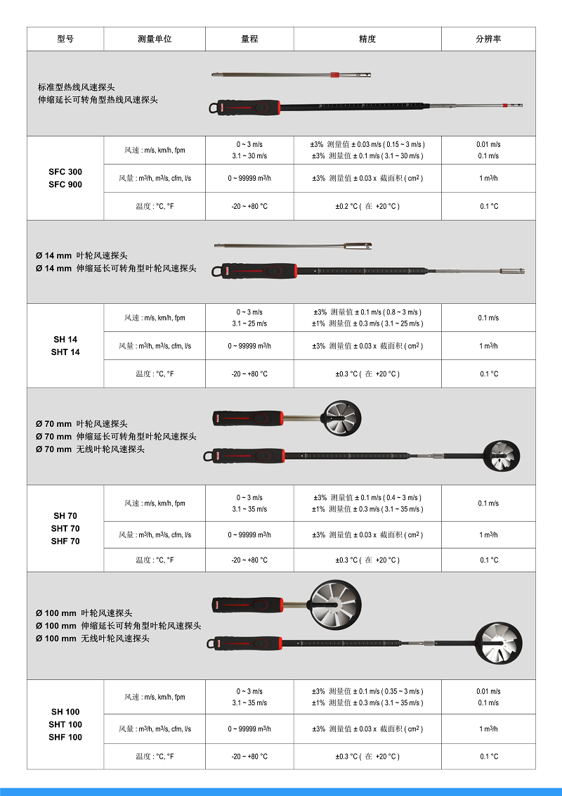 • 选购搭配各式皮托管和翼型平均式测片可测量管道内风速