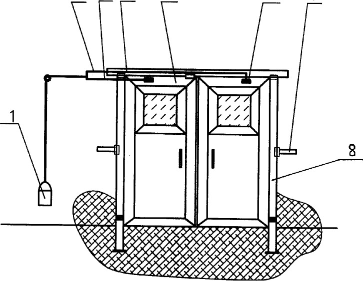 在如图1、图2所示的实施例中,一种矿用无压透视风门,它包括门板5、门框8、门梁4,门框8为风门两侧边框,门梁4横于门框顶部并与门框固定连接,门框8与门梁4上设计凸出的耳状连接片,连接片间通过螺栓固定,门框侧边及底部与被固定于墙体及地面的门框固定件7通过耳状连接片以螺栓连接。在门板上的弯板3通过滑轮机构与一坠锤1相连。门板5与门框8转动连接,门板5为两扇,两扇门板为反向对开形式,门板上开有透视窗,每扇门板上部固定有弯板3、直板6,横向的连杆2的两端与弯板3、直板6转动连接,弯板3、直板6与连杆2构成连杆传动机构。在每一门板的两面及其四周外缘镶有起气密作用的橡胶板。门梁上安装有挡板限位机构。