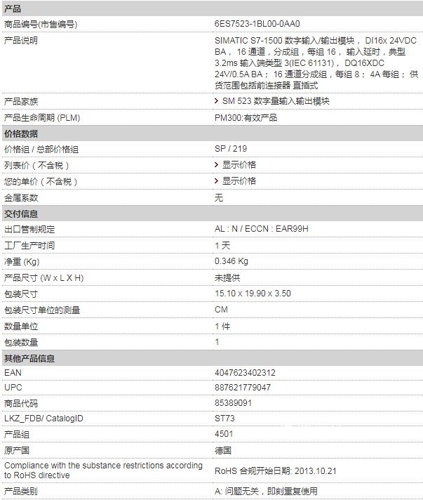 产品说明: SIMATIC S7-1500 数字输入/输出模块, DI16x 24VDC BA, 16 通道,分成组,每组 16, 输入延时,典型 3.2ms 输入端类型 3(IEC 61131), DQ16XDC 24V/0.5A BA; 16 通道分成组,每组 8; 4A 每组; 供货范围包括前连接器 直插式