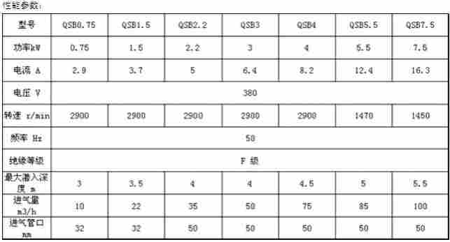 表中进气量及增氧能力是在标准试验条件下(20℃水温,气压101.325KPa),曝气机潜水深度3m,试验介质为清水时的试验值。如潜水深度进气量大于表中的数值,需用户提供潜水深度和进气量,以便本公司设计和提供优化的设备。