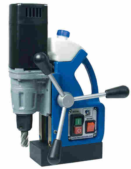 在通电情况下,打开磁座开关通过电磁效应产生上千公斤的磁力,使之能够吸附在钢板及结构件上,起到固定机器的作用,磁座的吸附能力越强,在工作时,磁座钻的机身能更加稳定,钻孔的精度亦越高。当打开机器开关机器转子部分高速旋转再通过传动齿轮组带动传动轴旋钻带动钻头运动,在需要钻孔的部位通过钻头进行切削钻孔,跟其火焰切孔相比钻出来的孔精度高,属于物理切削,不会产生化学反应,不会让材质变形。钻头前除了市面传统的麻花钻以外,还有专门用于磁力钻的空心钻头,这种钻头采用铣刀的原理,具有效率高,精度好的效果。