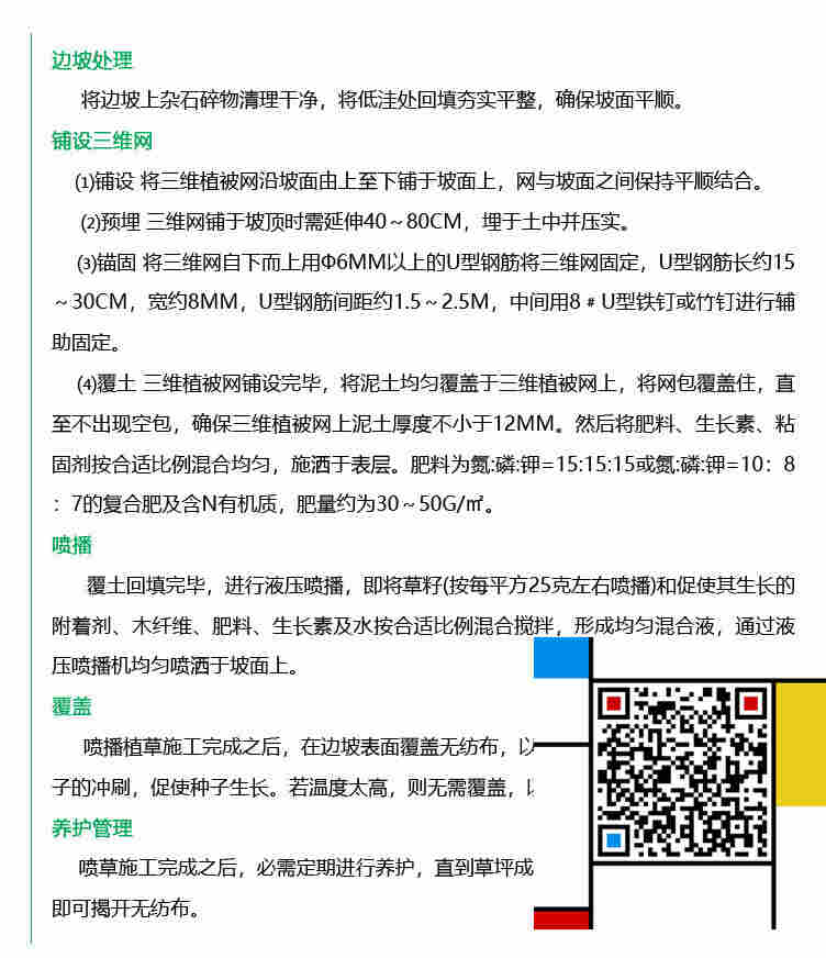 公司生产及销售土工格栅、土工布、土工膜、三维植被网、土工格室、土工网、土工席垫、复合土工膜、复合土工格栅、煤矿井下用钢塑复合假顶网、双向拉伸塑料护帮网、膨润土防水毯、排水板、防水板、三维复合排水网、抗裂贴、贴缝带、软式透水管、盲沟、生态袋、植生袋因此只要保持坡面湿润即可。4结论植生带(袋)是一种*的水土保持,生态绿化产品,具有工程防护与生物防护的优点,作为一种*的水土保持。早期防止雨水冲刷效果更好植生带(袋)工艺的保湿效果废弃矿山治理与复绿产品和工艺。