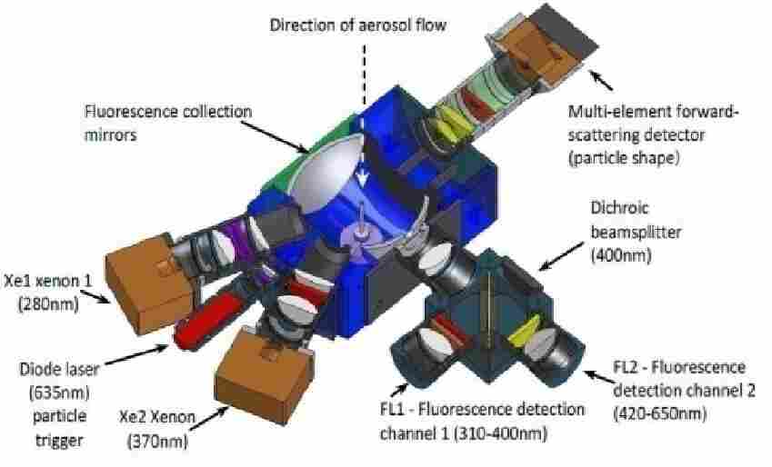 测量参数: 单颗粒光散射量; 单颗粒荧光量(三种独立的测量值); 气溶胶粒径; 气溶胶不对称因子