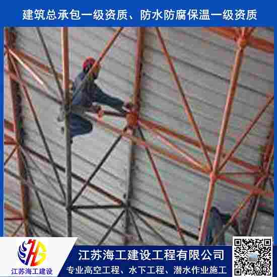 防腐保温工程:码头行车防腐、行车除锈刷油漆、行车油漆防腐施工、烟囱刷色环航标,凉水塔防腐,钢结构防腐,炉架防腐,网架防腐、管道防腐,铁烟囱油漆防腐,尿素造粒塔、电视塔防腐、电信塔防腐、发射塔防腐、排气塔防腐,各种铁塔防腐,烟囱(包箍、平台、爬梯、护网)防腐,储油罐防腐,龙门吊防腐、行车防腐,宾馆、大厦外墙刷涂料,煤棚输煤栈桥防腐,吊机防腐等工程。