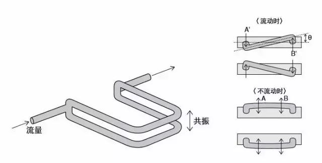 科里奥利式流量计在其自身内部利用称为科里奥利效应的 物理现象。如上图所示,流体流过振动的 U 形管时,流入 端 A 与流出端 B 之间会产生逆向的科里奥利效应,使 U 形 管扭曲。由于科里奥利效应与物体的重量和速度成正比关系,因此如果测量出扭曲量,便可知道质量和流量。