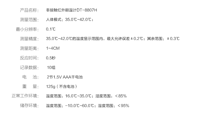 DT-8807H是华盛昌推出的2020年焕新升级版红外体温计,进口探头,0.5秒测温,人体温度和物体温度双模式测量,LC明亮背光大屏,温度补偿排除干扰,在35~42℃全温度段内测量精度可达±0.2℃。