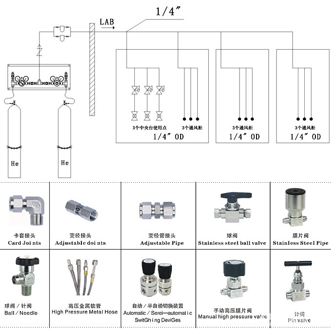 实验室气体管道工程设计安装系统概述1.1气路系统主要由气源切换系统(一级减压系统)、管道及连接件系统、二级调压系统、气体过滤纯化系统、气体报警系统、压力表、球阀等组成。对于一些易燃易爆气体,如氢气、乙炔等,必须加入气体回火防止器,其余惰性气体可根据需要增加单向阀。 2、实验室气体管道工程设计安装设计依据2.1甲方提供的设计需求说明2.2相关*设计规范《建筑设计防火规范》                               GB50016-2006《工业金属管道工程施工及验收规范》                 GB50235-97《电子工业洁净厂房设计规范》                       GB50472-2008《石油化工可燃气体和有毒气体检测报警设计规范》     GB50493-2009《输气管道工程设计规范》                           GB50251-2003《压缩空气站设计规范》                             GB50029-2003《氢气站设计规范》                                 GB50177-2005《工业金属管道设计规范》                           GB50316-2000《氧气站设计规范》                                 GB50030-91 3、实验室气体管道工程设计安装设备用气点清单如下:原子吸收室:  原子吸收      一台      Ar     C2H2离子色谱室:  离子色谱      一台      N2气相色谱室:  气相色谱      一台      N2    H2    Air硫化物室:    氮吹仪        一台      N24、实验室气体管道工程设计安装气路系统技术参数4.1、体设计说明在此项目中,为了完成实验功能,共需用到5种钢瓶气体:氮气(N2),氢气(H2),空气(Air),氩气(Ar),乙炔(C2H2)。气体由十三楼钢瓶间通往实验室各需求点,气瓶间需设置防爆墙,并设置在人流较少区域,同时应考虑全年排风。气体系统供应流程:供气气源系统→各个房间→二级减压→终端阀门。实验室气体管道工程设计安装贸易商订购其中,钢瓶气采用自动切换系统(含一级减压阀门),自动切换系统可通过压力原理,自动调节使用气瓶与备用气瓶之间的供应情况,即可避免因气源供应不及导致实验中断,又可以方便进行气瓶的更换。切换系统包含半自动调节阀、清洗阀、安全阀、汇流排、气瓶及阀门固定装置、电极点压力表以及系统内部的连接接头。采用二级减压可满足不同仪器的压力要求,同时可保证压力的稳定输送,且便于实验室分析项目调整及设备的变更。切换系统设置有清洗阀,以防止更换气瓶时外界空气或杂质进入管路系统,也方便在更换气瓶时先将管道中高压气体排空。切换系统设置安全阀,控制系统压力不过允许值,保证系统不因压力过高而发生事故。4.2、基本要求:为了保持气体的纯度及管道系统的气密性,所有气体管道、阀门、调节阀、压力表都采用SS-316L不锈钢,内表面BA级,全部采用标准件。为了便于更换维修,管件与阀门,管件与管件连接全部采用卡套连接。管道固定件采用不与金属化学反应的高分子材料(聚苯乙烯)。4.3、气瓶减压阀(一级减压阀、二级减压阀):气阀阀芯材料为316L不锈钢(有内衬TEFLON聚四氟乙烯高适用纯度),接口1/4”FNPT气瓶连接端规格适用于所有符合国际标准的气瓶。4.4、管路:所有气体管路都是高质量、完全退火、无缝不锈钢SS-316L、BA级别。管道尺寸为1/4”,*承受压力为300bar。4.5、钢瓶连接:钢瓶与一级减压阀采用不锈钢高压金属软管连接,外管带弹簧保护,内管不锈钢丝缠绕,耐压20Mpa。 4.6、终端使用点:所有气体进入使用点前均加装球阀,同时在二次减压阀前需加装开关球阀。 5、实验室气体管道工程设计安装管路安装5.1各气体系统所用管道规格:项目    气体名称   主管道   实验室主管道  使用点管道            N2     1/4”OD    1/4”OD       1/4” OD            H2     1/4” OD   1/4”OD       1/4” OD            Air    1/4” OD   1/4”OD       1/4” OD            Ar     1/4” OD   1/4”OD       1/4” OD             C2H2   1/4” OD   1/4”OD       1/4” OD5.2、在管道的行进路线中,每隔1米应设置一组管夹。管道固定件(管夹)应采用耐高温的金属材料,坚固、轻巧、耐用。5.3、所有管件在安装进系统前,应用高纯氮气(99.999%)进行三遍以上的吹扫。管道铺设时,采用弯管器和切管器操作。管道切断后,应用工具处理断口。管道穿墙及穿地板时,应设置套管。所有螺纹连接处应采用密封带密封,保证更好的密封性。管道弯管器及切管工具均为不锈钢材料,焊针等其他材料和工具均可在现场温度条件下(-40℃—+40℃)正常使用。实验室气体管道工程设计安装贸易商订购5.4、所有调节阀固定面板,所有出口点控制面板及管道上,都应贴设标有对应气体的成分的气体标头。5.5、所有系统部件安装完毕后,应用高纯氮气进行三遍以上的吹扫。5.6、管路系统安装完毕后需要做管路试压测试。6、实验室气体管道工程设计安装材料要求6.1、 高压波纹软管:外表不锈钢金属网内衬PTFE材质,长度1米以上,通径大于6MM。一端符合标准钢瓶的连接型号,另一端连接自动切换系统。承受大于3000PSI。其特性为:洁净光亮、柔软、防腐。6.2、 低压报警器:低压报警器多触点可模拟数据输出型,报警器可蜂鸣闪光同时显示报警气体的
