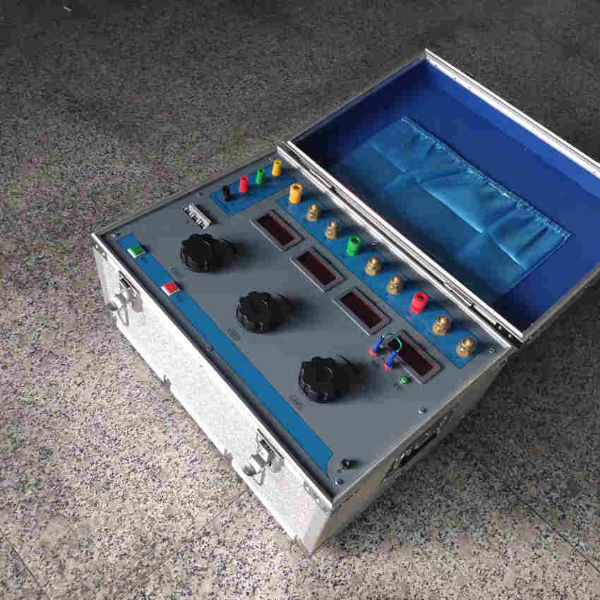 测试时应盖好热继电器盖,小电流值热继电器用小电流档位,把三个热元件串接后,再接在相应的测试柱上,常闭点接辅助接点柱上,量程转换开关选至适当电流档位,输出调节手轮置零位,自锁开关断开,检查各接线端柱接触应良好,打开电源开关,按启动钮,测试电源接通,旋转输出调节手轮至被测热继电器额定电流,使双金属片达到热稳定状态,以此稳定热态再旋转输出调节手轮使测试电流到额定电流的倍,计时从零开始,进入测试阶段,规定时间内,热继电器应脱扣为合格一项,热继电器接点断开,测试电流消失,计时停止,并显示测验时间,测试终了信号由灯光和声响给出,当要停止信号时可按关断声光开关。