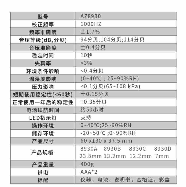 AZ8930标准音源校准器麦克风噪音计