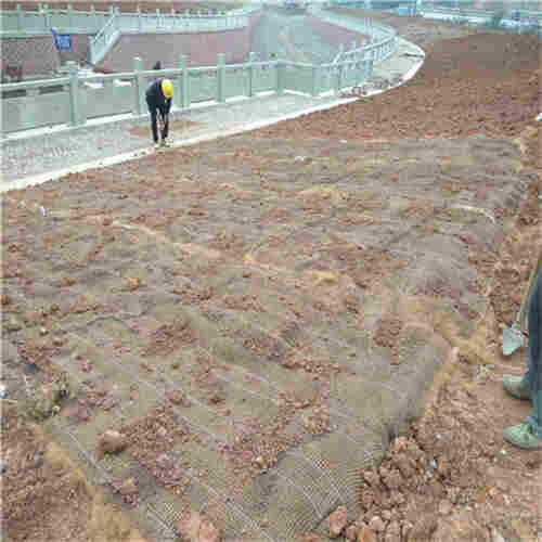 二、护坡生态毯施工事宜:1、要调查确认施工土质是否适合植物生长情况,不能是岩石、碎石、砂土或重粘土;2、施工时间选择月平均气温持续在10~15℃的月份动工;3、铺设完成后如有施工条件覆土厚度在1.5公分左右,可以是有机土或砂土;4、施工完成后,不要在植生布上面走动,防止踩坏刚发芽的幼苗