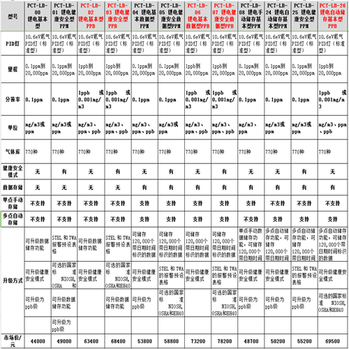 下面大家可以通过一张对比表格了解一下英国离子虎牌VOC检测仪各型号之间的区别: