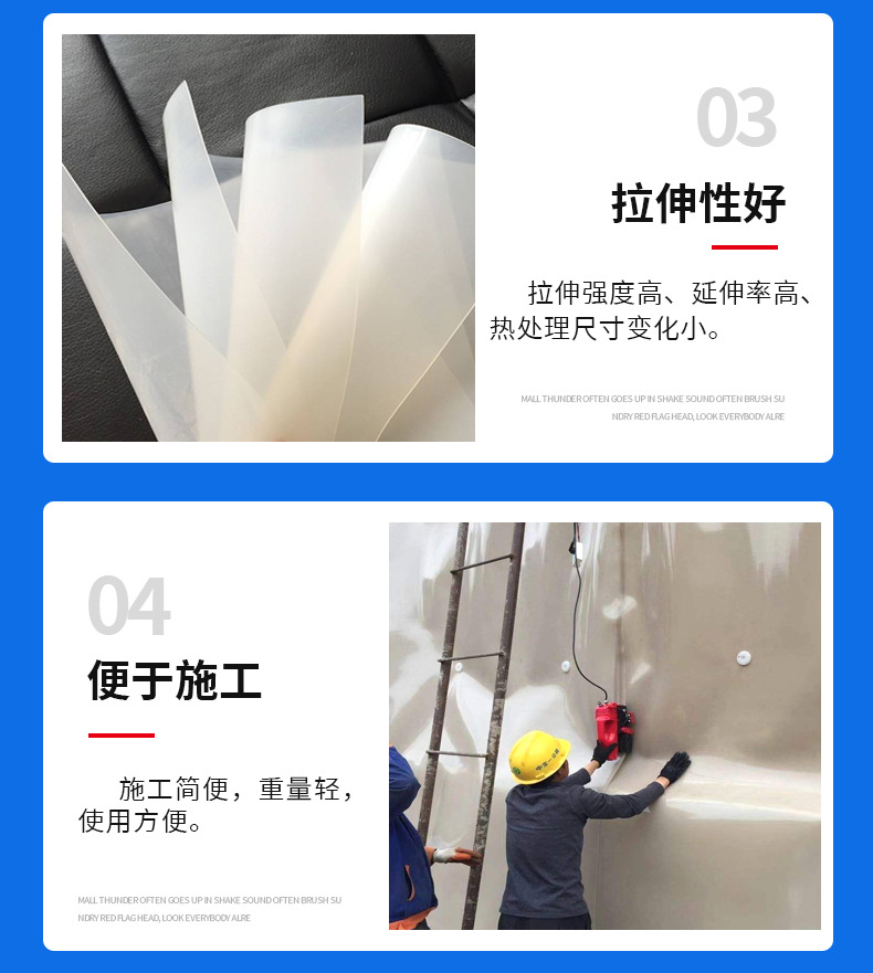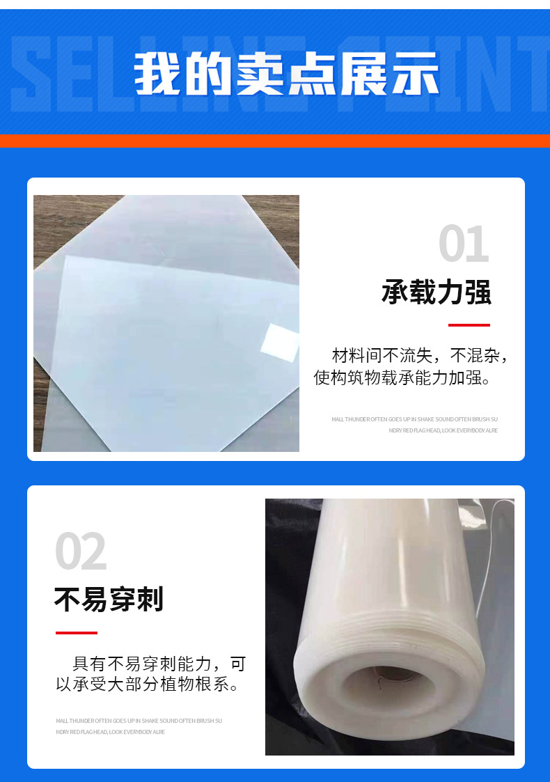 3.高分子自粘式防水卷材 *高分子自粘防水卷材,也叫预铺自粘式高分子防水板,是由高分子片材(PVC、PE、EVA、ECB、TPO等)与自粘胶、隔离膜组成,并可根据需要在高分子片材上复合织物加强。能够与混凝土结构层*性粘结为一体,中间无窜水隐患;即使卷材局部遭遇破坏,又基本上被混凝土结构堵塞,卷材防水层和混凝土结构层,互为藩篱,形成了*的防水体系,大大提高了防水层的可靠性。*高分子自粘防水卷材广泛应用于高速公路、铁路、地铁隧道、各种工业、建筑业的混凝土屋面防水,地下室、防空洞、垃圾处理等防水防渗漏工程。产品NO.2土工布1.长丝土工布长丝土工布为聚酯长丝针刺无纺土工布,不含化学添加剂,也不经热处理,是环保型的建筑材料。具有良好的力学功能,透水性好,抗腐蚀,抗老化,具有隔离、反滤、排水、保护、稳固、加筋等功能,能适应凹凸不平的基层,能抵抗施工外力破坏,蠕变小,长期荷载下仍能保持原有的功能。同等克重规格下,各向拉伸强度均高于其它针刺无纺布。贵州中驰生产的长丝土工布(聚酯长丝土工布/聚酯无纺布/长纤土工布)为PET材质,规格型号100g-600g,尺寸1-6m(其他尺寸可定做),有白色、绿色等多种颜色型号。该产品具有抗老化,耐酸碱,耐磨损,柔韧性好,施工简便等特性,具有隔离、反滤、排水、保护、稳固、加筋等功能。2.短丝土工布短丝土工布是非织造及工业用布的一种,是采用纤维纤度为6-12旦,长度为54-64mm的涤纶卷曲短纤维为原材料。通过无纺生产设备的开松、梳理、杂乱(短纤维相互交织在一起)、铺网(规格化缠结固着)、针刺等生产工艺的流程制成布状。贵州中驰生产的短丝土工布(聚酯长丝土工布/聚酯无纺布/长纤土工布)材质为涤纶短纤,规格型号100g-600g,尺寸1-6m(其他尺寸可定做),有白色、绿色黑色等多种颜色型号。广泛应用于铁路路基的加筋、公路路面的养护、运动馆、堤坝的防护、水工建筑的隔离、遂洞、沿海滩涂、围垦、环保等工程。。tshtgcl888