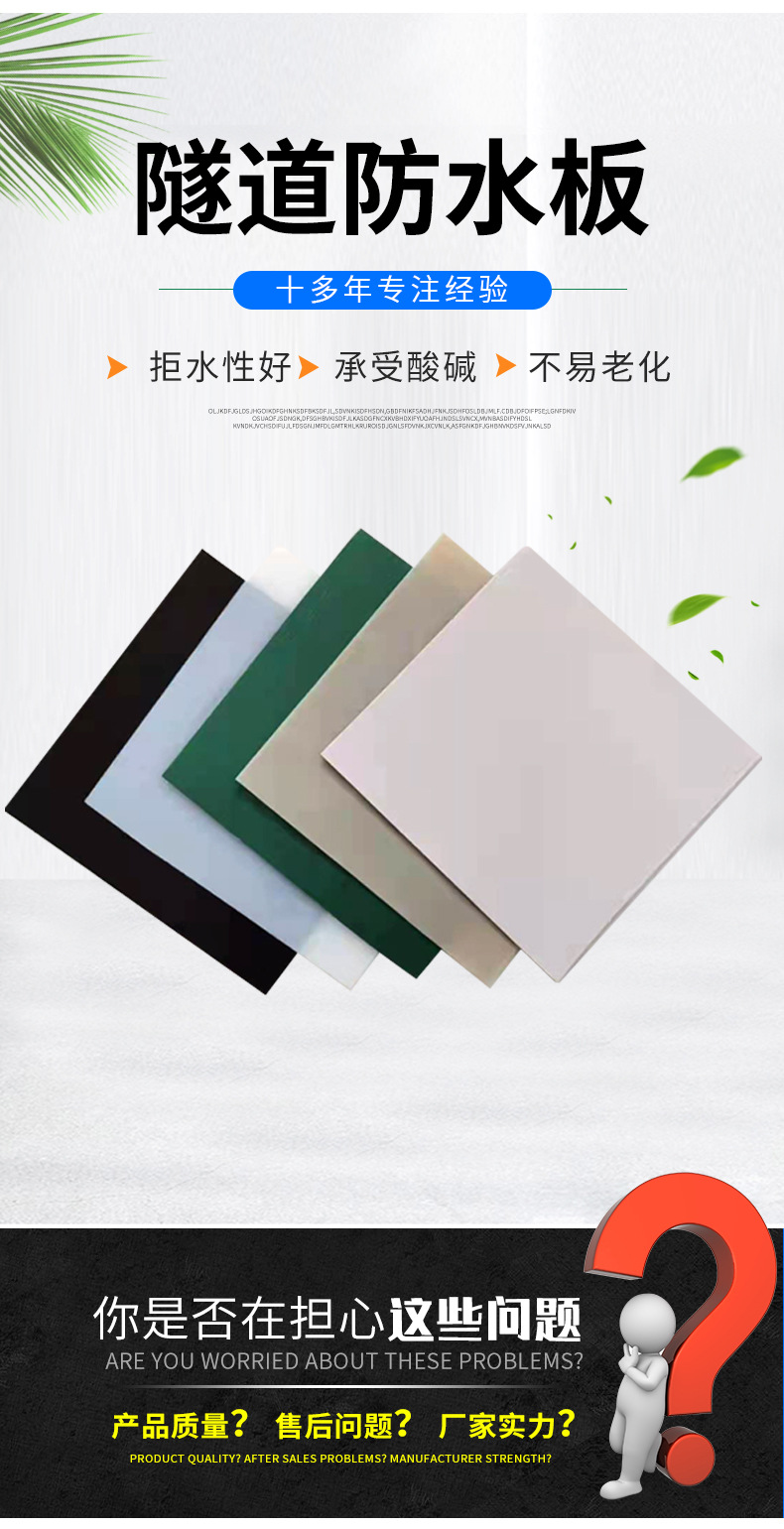 吊挂式隧道防水板(吊带防水板)是一种*隧道防水材料,实现无穿通钉施工悬吊式排挂一次性完 成,可大大简化传统防水材料在隧道中的施工难度,提高铺设质量和铺设效率,缩短工期,大幅度 降低工程综合造价,具有极强的市场竞争优势。德州隧道防水板主要有吊带防水板,EVA防水板等产品系列分离式防水板:土工布与吊带土工膜板分层铺设复合式防水板:土工布与土工膜整体复合,点式、条式复合,产品边缘留有拼接焊缝,并且土工布 上备有吊带,可在现场整体铺设,一次性完成。产品规格涤纶针刺土工布:100-800g/m2 PE/EVA/ECB/ECD 合成树脂卷材厚度:0. 8、1. 0、1. 2、1. 5、2. 0mm 产品幅宽:0. 5-6. 2m 产品长度:按用户要求技术性能达到GB18173. 1-2006标准中规定的技术指标。