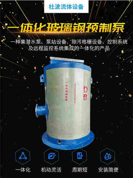 四川杜玻环保科技有限公司dubo主要从事生产、销售、安装一体化预制泵站、污水处理泵站、雨水收集提升泵站、轴流泵站、粉碎格栅、截流井、阀门井、恒压变频供水系统、玻璃钢(GRP)管道&化粪池为一条龙的源头生产厂家,欢迎随时来电咨询!