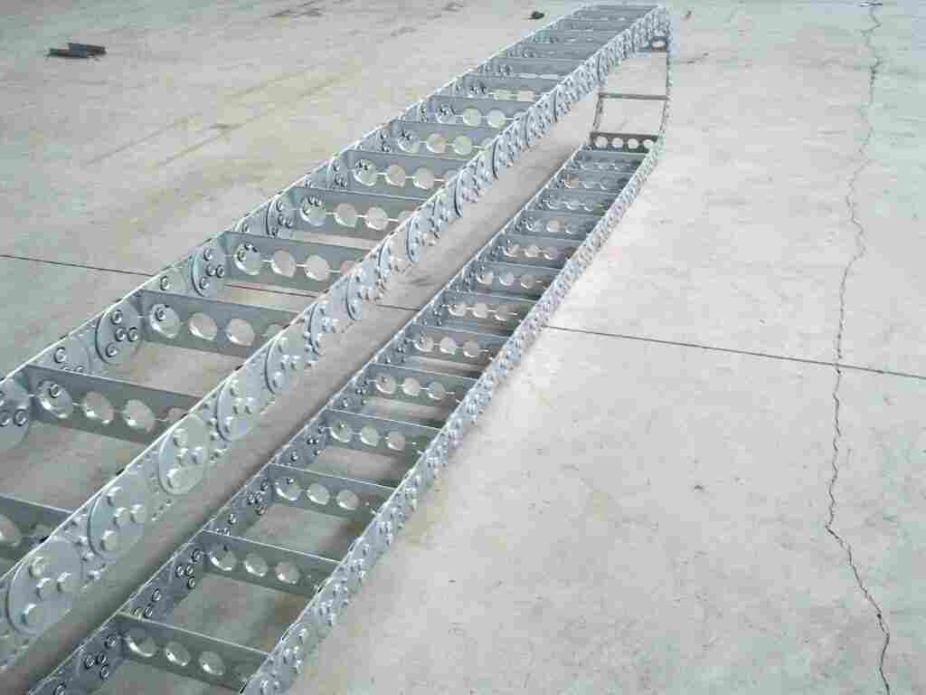 钢制拖链也叫钢铝拖链 分封闭和半封闭型,引进德国技术制造,是一种重型拖链,承载量高,架空长度大,适用于大中型机械,在使用过程中,大改善了拖链的扭曲和变型。