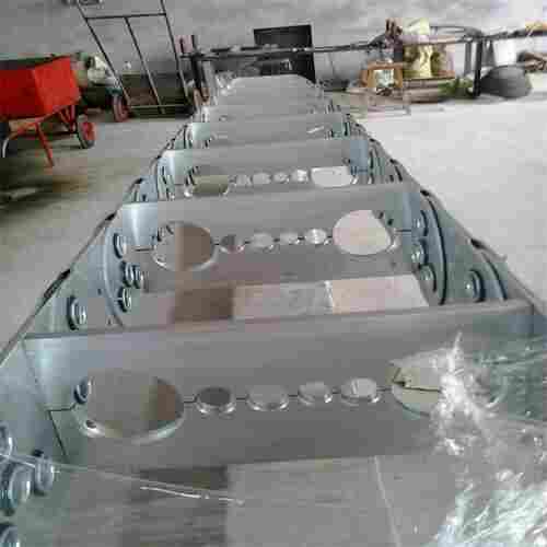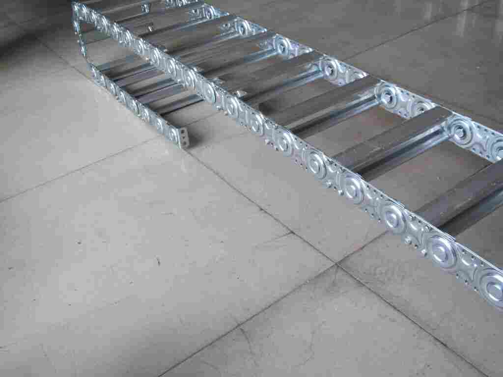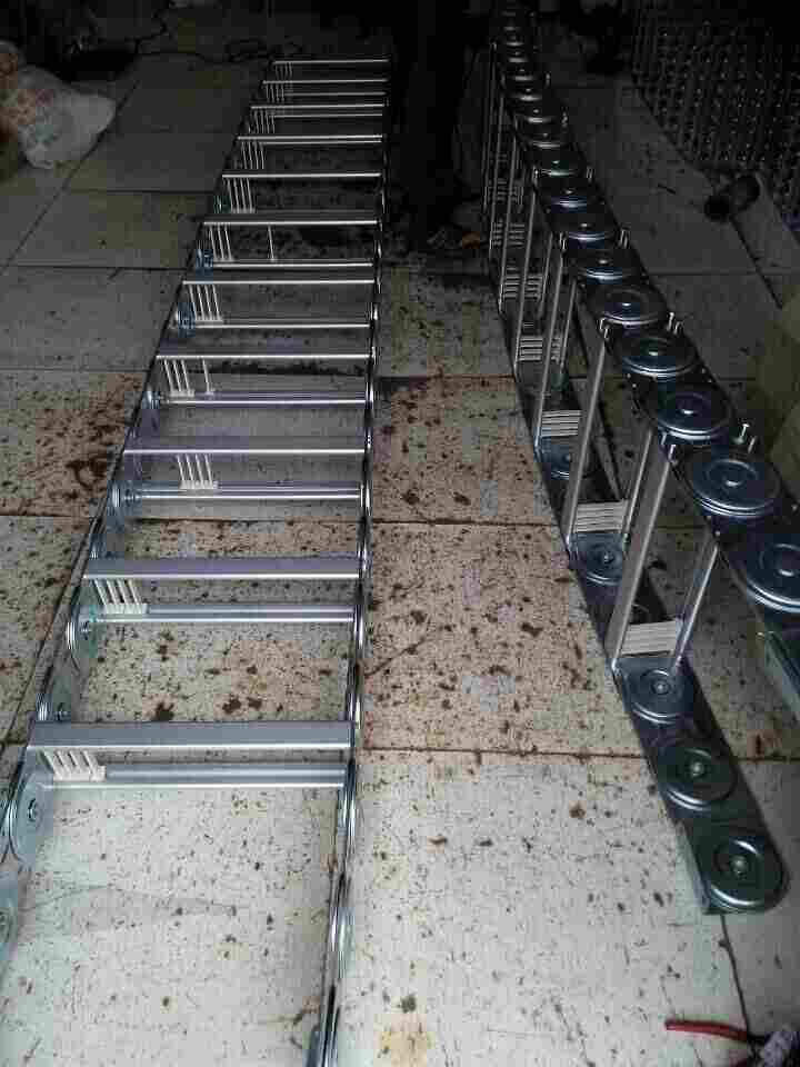 支撑板(挤拉铝合金),轴销(合金钢)等部件组成.使电缆或橡胶管与拖链之间不产生扭曲变形,链板经镀铬处理外形效果新颖,结构合理,灵巧强度高,钢铝拖链钢性好,不变形.安装方便,使用可靠。*生产穿线塑料尼龙拖链 镗铣床金属钢铝拖链的主体是由链板(采用钢板经淬火后再抛光镀铬/镀锌/喷塑处理)易拆装。适用于工作母机,移动机械等。其弯曲半径为50-600mm,拖链宽度可按用户要求定做,弯曲半径从50-800之间。拖链广泛应用于建筑,机床,铁路,车辆,化工,汽车,监控,建筑装修。横隔片,能有效的控制电缆线的摩擦和区分外形美观,噪音低,运行流畅 升级款具有长架空,载重强特点,尼龙封闭拖链拖链可承载数量多,重量大的电缆及油管,自由悬置(允许不用支承轮)长度大。