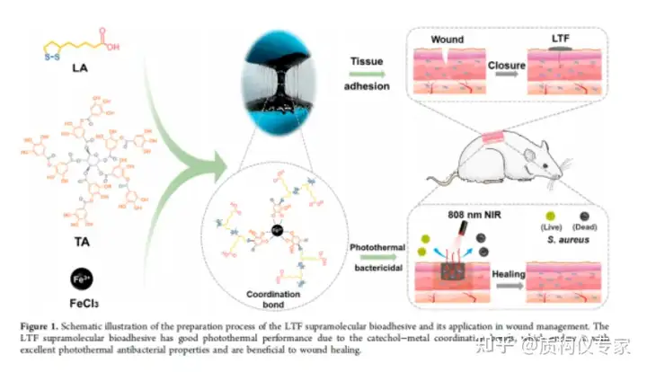 然而,很少有深入的研究探索天然小分子的生物粘合剂极具促进伤口愈合的发展潜力。因此,为探究一种安全、有效的抗菌粘合剂,本研究构建的LTF生物粘合剂是由α-硫辛酸、单宁酸和氯化铁,通过一种简单的绿色途径合成,能够促进伤口的愈合,为伤口处理提供较高的应用价值。(见图1)