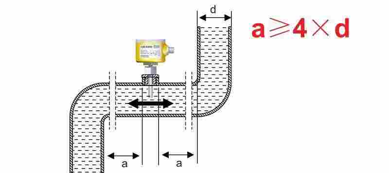 当所安装管道前端存在弯管时,流量开关安装的位置应距离弯管或交叉口的直管距离不应小于4倍管道直径,(即:a≥4×d 如图)