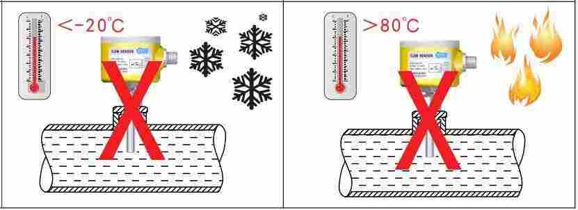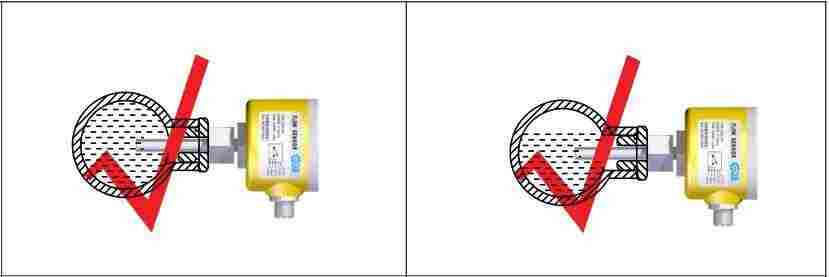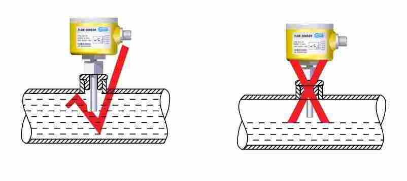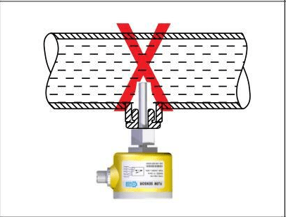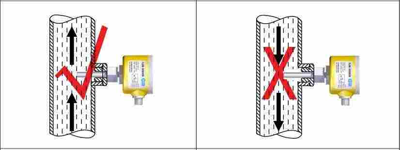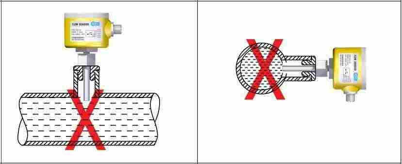禁止倒立安装。此安装方式会使用管道底部的沉积物覆盖探头,导致流量开关无法正常工作,同时也不利于设定流量开关的参数。