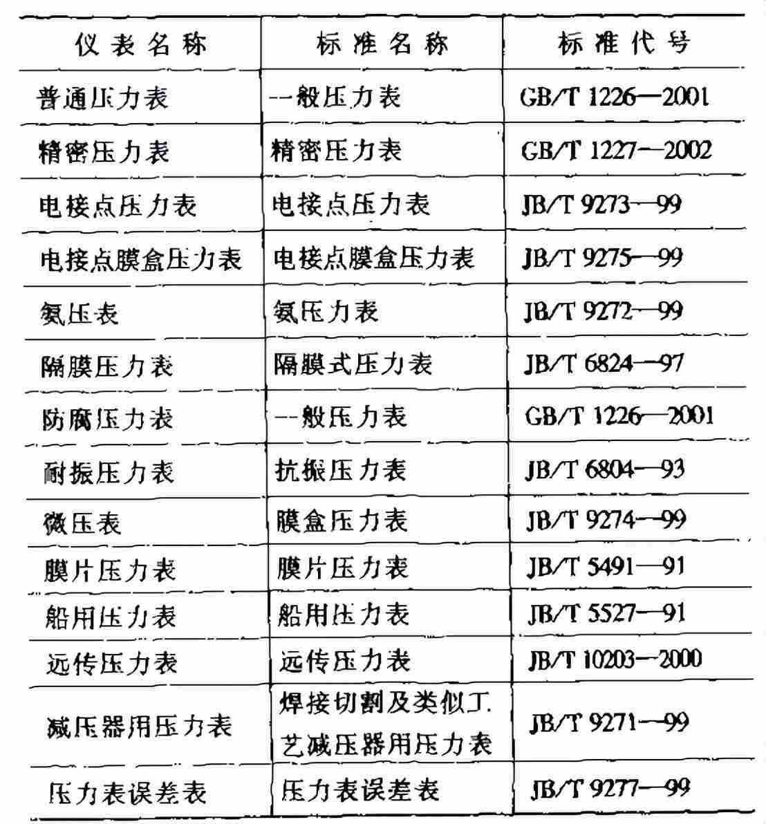 各种压力表的生产制造标准名称及代号是什么?