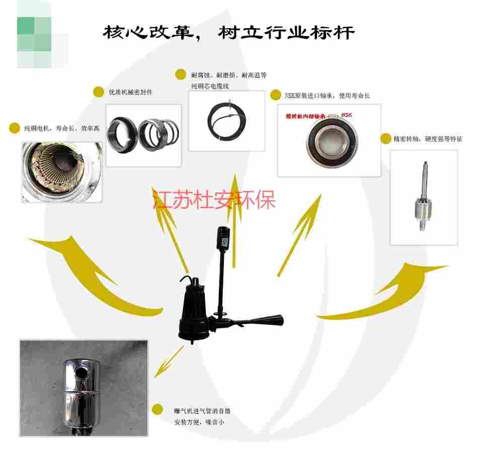 江苏杜安环保QSB潜水射流曝气机由潜水电泵与喷射泵组成,从而使水体搅动与充氧同时进行,既可获得较高的氧气吸收率,又具有叶轮无堵塞优点。