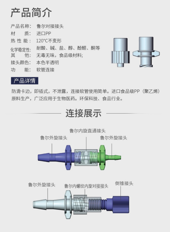 防滑卡边,即插式,不泄露,连接软管使用简单。进口食品级PP(聚乙烯)原料,应用于生物医药/科技/食品行业。