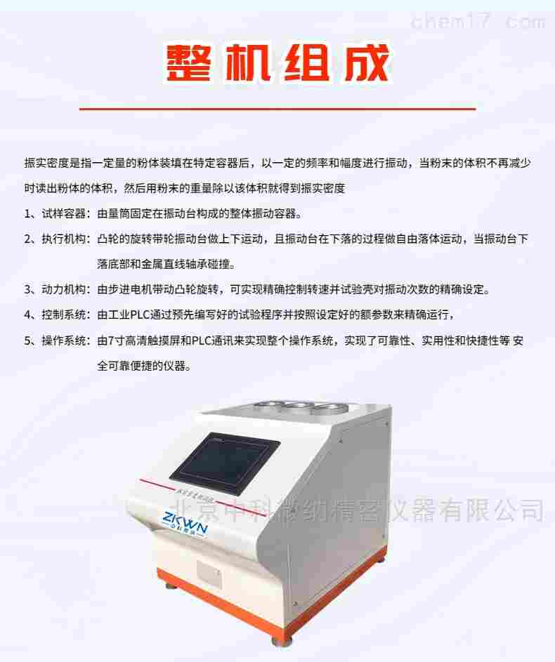 ZS703型粉体密度测试仪由电机、振动组件、PLC中央处理器和7寸高清触摸屏等部件组成。可自设振动次数,振动过程中振动组件以小角度旋转保证物料均匀等特点。