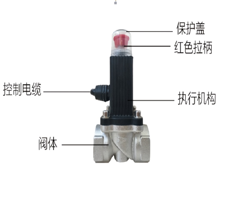 ◆ 阀门在关闭状态只有一种开阀方式:手动用力向上拉起红色手柄,即可开阀。开阀状态可自保持。