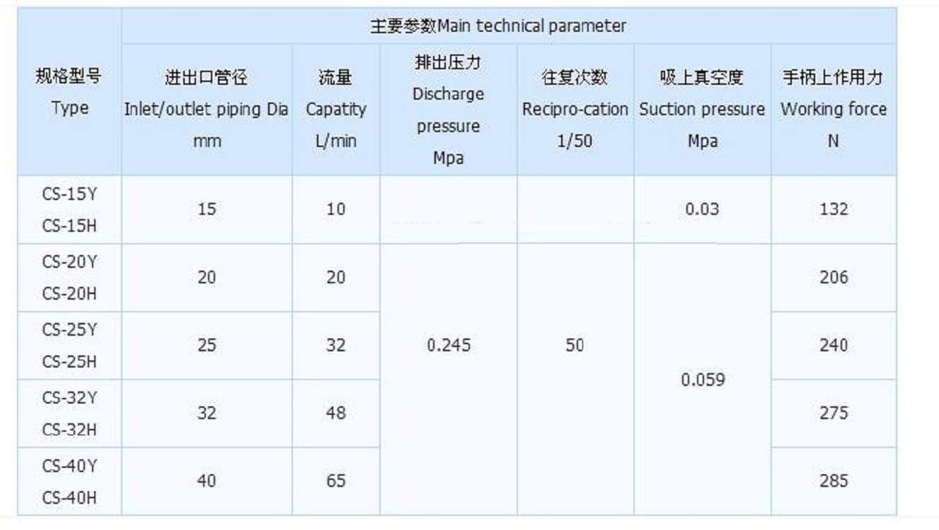 CS系列手摇泵中的Y型适用于抽送淡水、燃油。H型适用于抽送海水、污水。