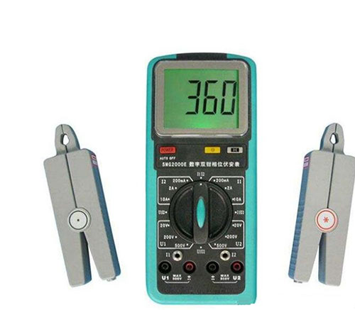 数字双钳相位伏安表是专为现场测量电压、电流及相位而设计的一种高精度、位、便携手持式、双通道输入测量仪器。用该表可以很方便地在现场测量U-U、I-I及U-I之间的相位,判别感性、容性电路及三相电压的相序,检测变压器的接线组别,测试二次回路和母差保护系统,读出差动保护各组CT之间的相位关系,检查电度表的接线正确与否等。采用钳形电流互感器转换方式输入被测电流,因而测量时无需断开被测线路。测量U1-U2之间相位时,两输入回路绝缘隔离,因此避免了可能出现的误接线造成的被测线路短路、以致烧毁测量仪表。显示器采用了高反差液晶显示屏,大字符,以获得视觉效果。