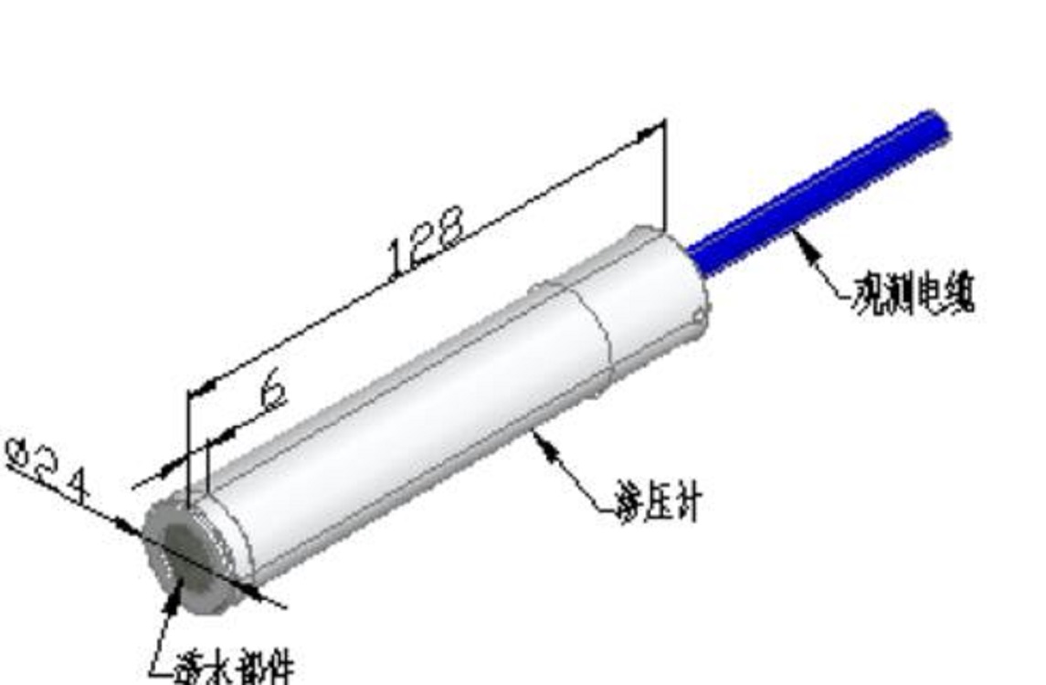 渗压计加装配套附件可在测压管道、地基钻孔中使用,渗压计为全不锈钢结构,24×128mm