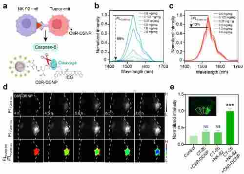 免疫细胞治疗是一种革命性的癌症治疗方法,利用免疫细胞的力量选择性地靶向并消灭肿瘤细胞。然而,由于传统影像学方法需要每2-3周进行一次评估,该疗法的临床应用往往受到延迟治疗评估的限制。为了解决这一关键挑战,张凡团队*的研究开发了一种非侵入性纳米传感器C8R-DSNP,旨在第二近红外长波段(NIR-II-L,1500-1900 nm)特异性实时监测免疫细胞活动。这一创新策略显著增强了深层组织成像能力,并加速了对治疗效果的评估(仅需4.5小时)。