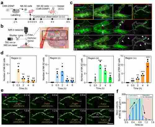 此外,免疫细胞治疗过程中,了解NK细胞如何在肿瘤微环境中迁移并发挥作用,对于优化治疗策略至关重要。因此,研究团队利用 C8R-DSNP 标记 NK-92 细胞,并将其回输至肿瘤小鼠体内,连续8小时对血管内和肿瘤组织中的NK细胞进行单细胞追踪。并且,高时空分辨率的NIR-II-L显微成像揭示了NK-92细胞在从肿瘤边缘的外围血管逐步迁移至肿瘤实质的过程:在肿瘤实质中,NK-92 细胞以 51.5 μm/s ~ 0.0 μm/s低速爬行,进入血管后速度增至 238 μm/s。这对了解NK细胞在肿瘤微环境中的动态迁移模式提供了新的依据。