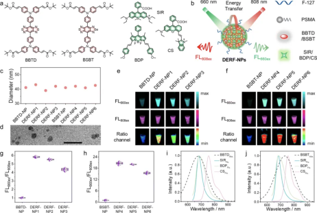 图1.(a) 能量受体(BBTD 和 BSBT)和供体(SIR、BDP 和 CS)的化学结构。 (b) 基于能量转移机制的双激发比率型NIR-II荧光成示意图。 (c) 各种DERF-NPs的流体力学直径(上图)和 (d) DERF-NP4的代表性透射电镜图像(下图)。 (e 和 f) 具有不同组分的DERF-NPs的NIR-II荧光图像。分别在660 nm和808 nm激发下,在1000–1700 nm范围内获取DERF-NPs的荧光图像。 (g 和 h) (e) 和 (f) 中DERF-NPs的NIR-II荧光强度比(FL660ex/FL808ex)的定量分析。 (i 和 j) BBTD和BSBT的吸收光谱以及SIR、BDP和CS的荧光光谱。