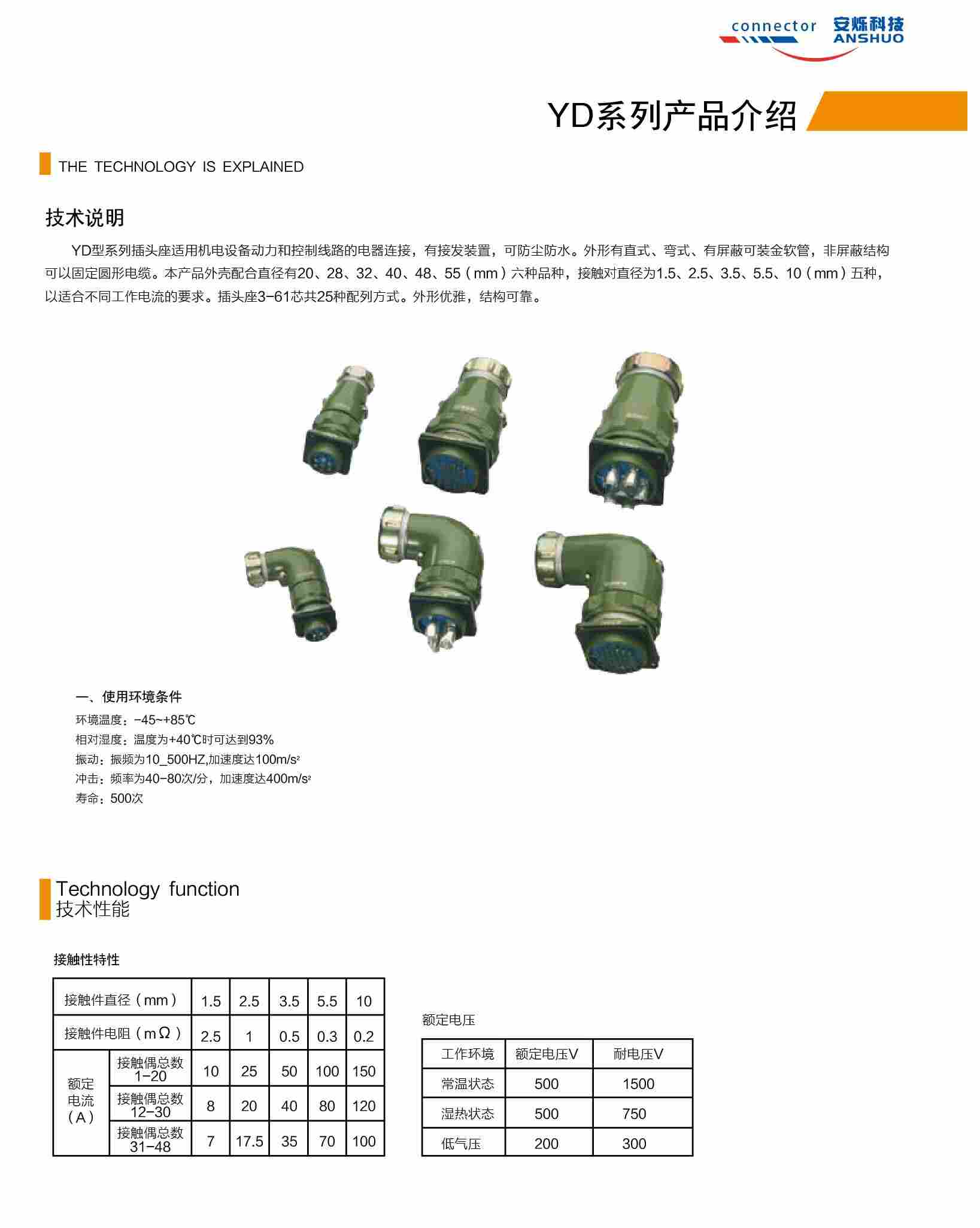 YD系列圆形电连接器适用于各种磨电设备,特别是磨床的动立线路个控制线路的电气连接。连接器符合GB5226-85《磨床电气设备通用技术条件》插头,插座规定要求,按GB4942-85《低压电器外壳防护等级》,其防护等级为IP54。其结构特点如下:连接器插座的安装尺寸与P型插头座完全相同。有保护接地极。连接时,保护接地极先接通,而后载流极接通。分离时,载流极先断开,而后,保护接地极才断快。能防尘和防溅水。插头和插座均有保护罩,使插头插座分离后,能防止灰尘和液体侵入。插头外壳有固定金软管和圆形电缆两种结构