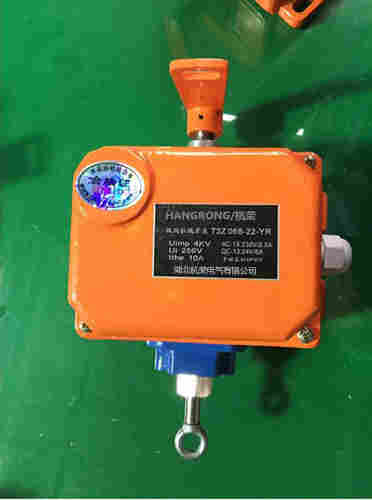 紧急停止拉绳开关的钢丝绳一端固定在一个固定的拉线螺栓上,另一端固定在开关臂上,钢丝绳每三米用一个有孔螺栓支撑,开关到固定点的距离不应过24米,两开关间的距离不应过48米。当外力促使开关臂杆转动到报警位置时,触动微动开关并锁定,直到人工复位。标准拉线开关防护等级为IP65,适应于室内外安装。表面经特殊处理后可用于酸、碱、盐性区域。镀镍表面用于强腐蚀区域。