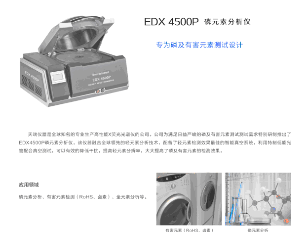 天瑞仪器是全球的生产高性能X荧光光谱仪的公司。公司为满足日益严峻的磷及有害元素测试测试需求特别研制推出了EDX4500P磷元素分析仪。