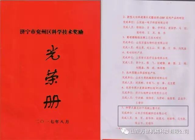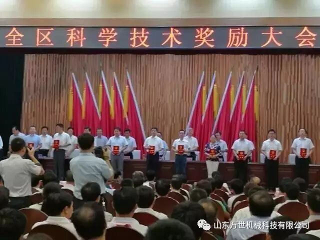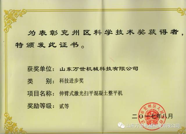 2017年8月18日上午,兖州区科学技术奖励大会在区政府D308会议室召开,会议由区委副书记、区长王骁主持,区委书记王宏伟作了重要讲话。区领导于立武、刘英会、寇宁、徐继瑞、王仁娜、唐军、马刚、王从奇、屈耀武出席了会议。山东万世机械科技有限公司“伸臂式激光扫平混凝土整平机” 项目荣获科学技术二等奖。