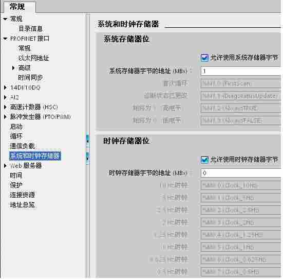 在 “项目树” > “S7-1200” > “设备组态” 中,选中 CPU ,然后在下面的属性窗口中,“属性” > “系统和时钟存储器” 下,将系统位定义在 MB1,时钟位定义在 MB0,如图2.所示。
