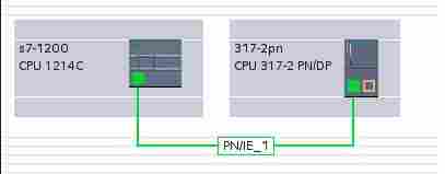 在项目树 “项目树”>“设备和网络” >“网络视图” 视图下,创建两个设备的连接。用鼠标点中 S7-1200 上的PROFINET通信口的绿色小方框,然后拖拽出一条线,到另外一个 317-2pn 上的PROFINET通信口上,松开鼠标,连接就建立起来了,如图4.所示。