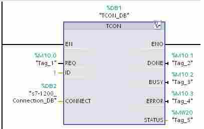 5.在 S7-1200 中调用并配置“TCON”、“TSEND”、“TRCV” 通信指令