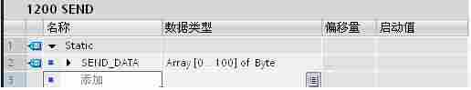 通过“项目树”>“S7-1200”>“程序块”>“添加新块”,选择“数据块” 创建 DB4 块,选择“标准-与S7-300/400 兼容”,点击“确定”键,定义发送数据区为 101 个字节的数组,如图7.所示,结果如图8.所示。