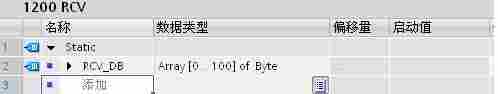 通过“项目树”>“S7-1200”>“程序块”>“添加新块”,选择“数据块” 创建 DB5 块,选择“标准-与S7-300/400 兼容”,点击“确定”键,定义接收数据区为 101 个字节的数组,如图10.所示,结果如图11.所示。