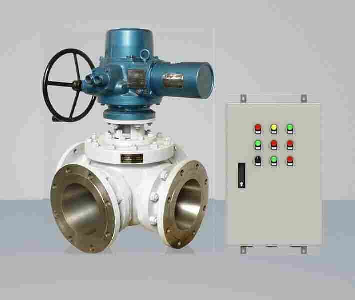 电动执行机构带动四通钢球阀芯旋转,每转90角,供水方式切换一次。