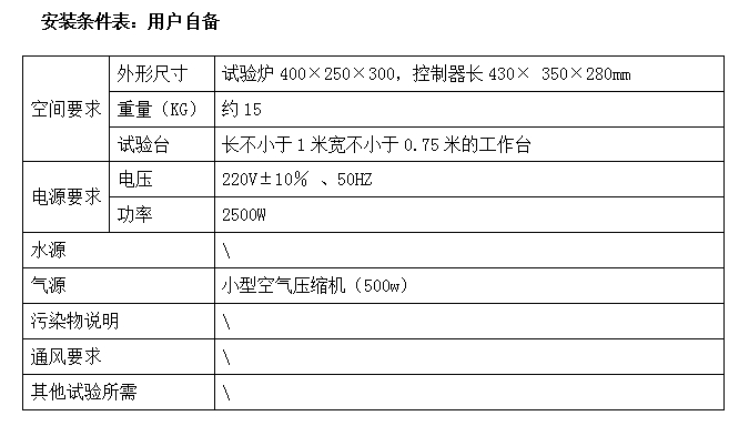 15. 设备外形尺寸:试验炉400×250×300,控制器长430× 350×280mm