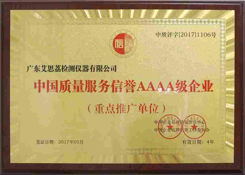 热烈祝贺“广东艾思荔检测仪器有限公司”被企业质量评价中心、企业培育工作委员会等机构联合授予“质量服务信誉AAAA级企业”荣誉称号。